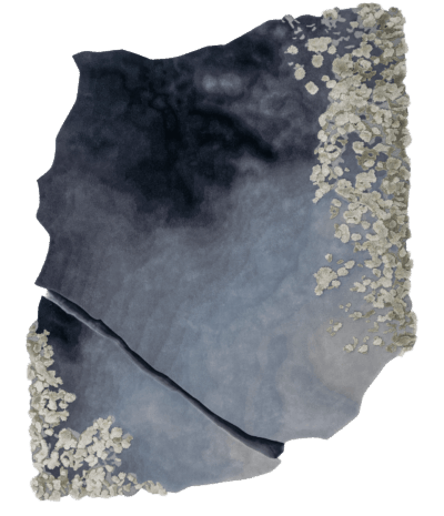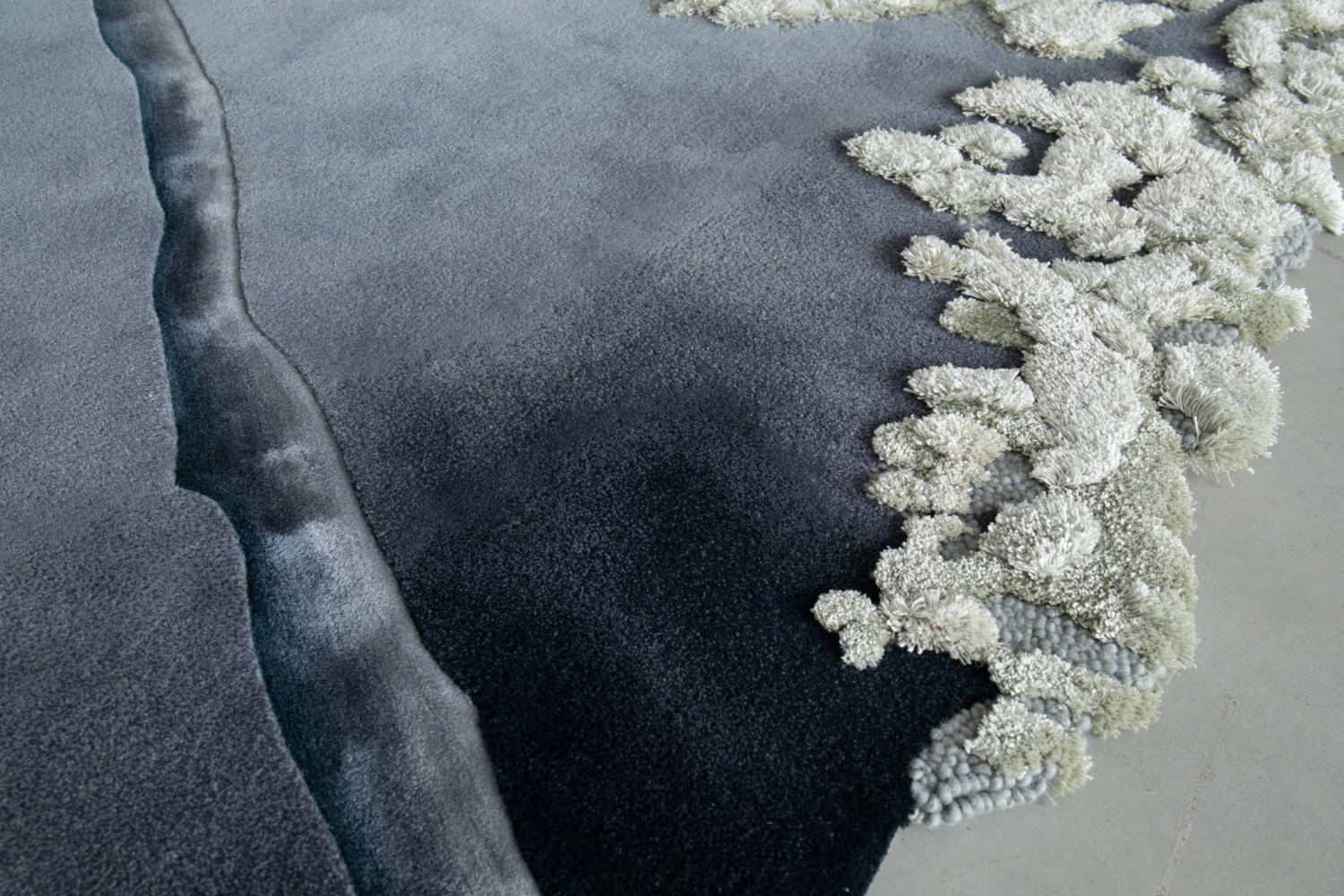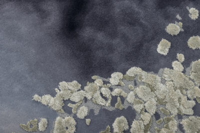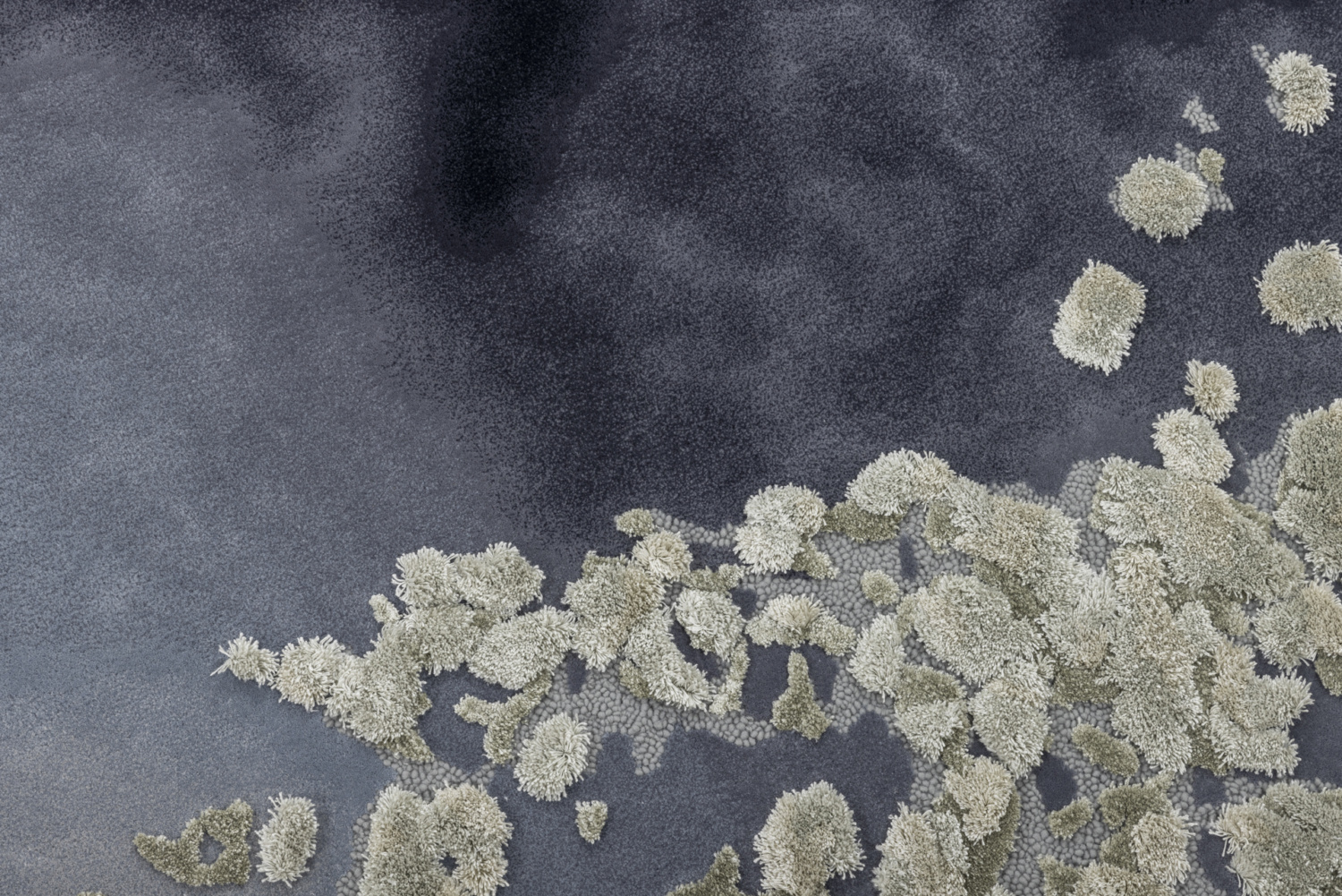 An homage to bleached coral reefs, this rug makes use of felted wool and silk to suggest aquatic vegetation on a now-broken shoreline. Pale, ivory tufts bloom out of a dynamic, inky background.