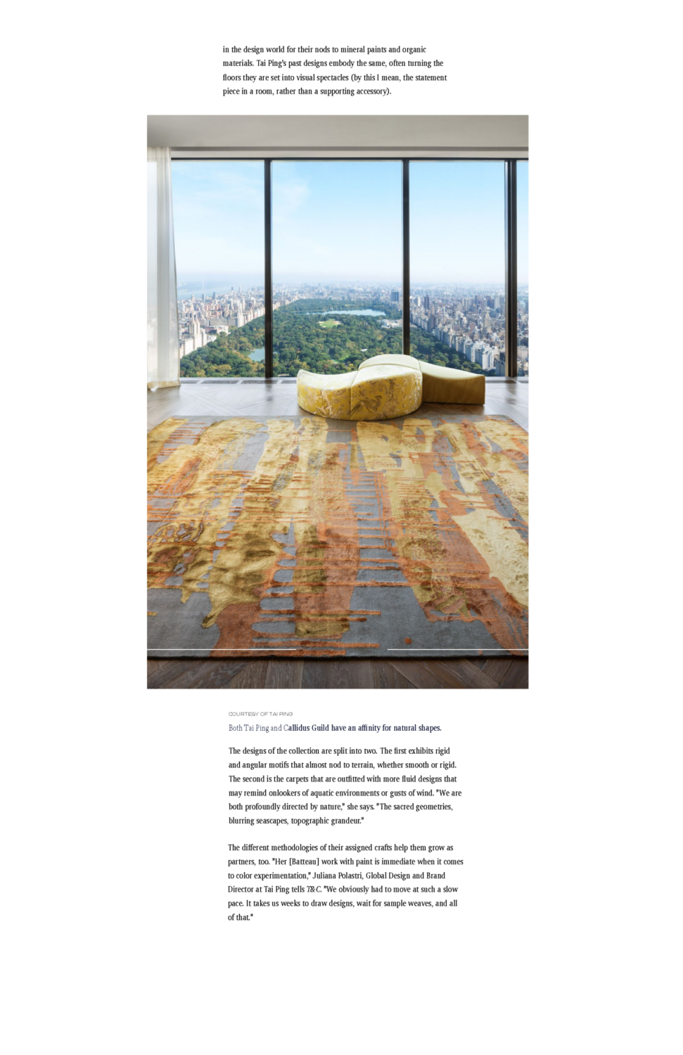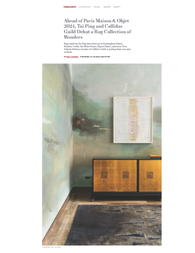 The US magazine Town & Country devotes an article of the collaboration between a decorative arts studio, Callidus Guild and Tai Ping. The lifestyle magazine explains the processus of the creation and deciphers all the carpets in the collection.